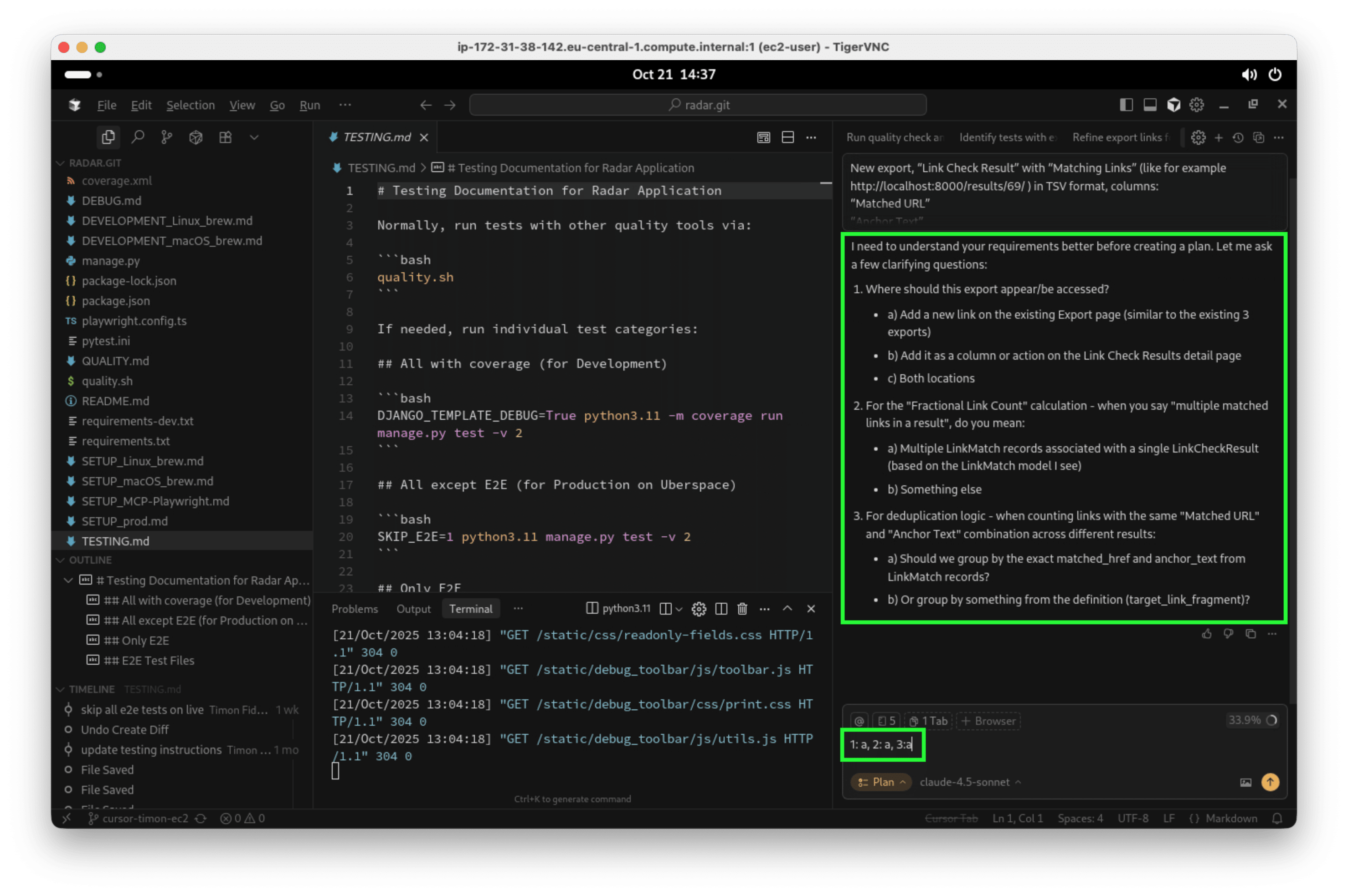 Dank Planungsmodus stellt der Agent von sich aus Fragen, auch mit einem Claude Sonnet Modell. Das ist ein Fortschritt! Der normale Agent fängt sonst manchmal schon an, schlechten Code zu produzieren, wenn man nicht dazu schreibt, dass er zunächst Fragen stellen soll. Dank der vorgeschlagenen Antworten kann ich sehr knapp antworten, siehe unten rechts im Screenshot: