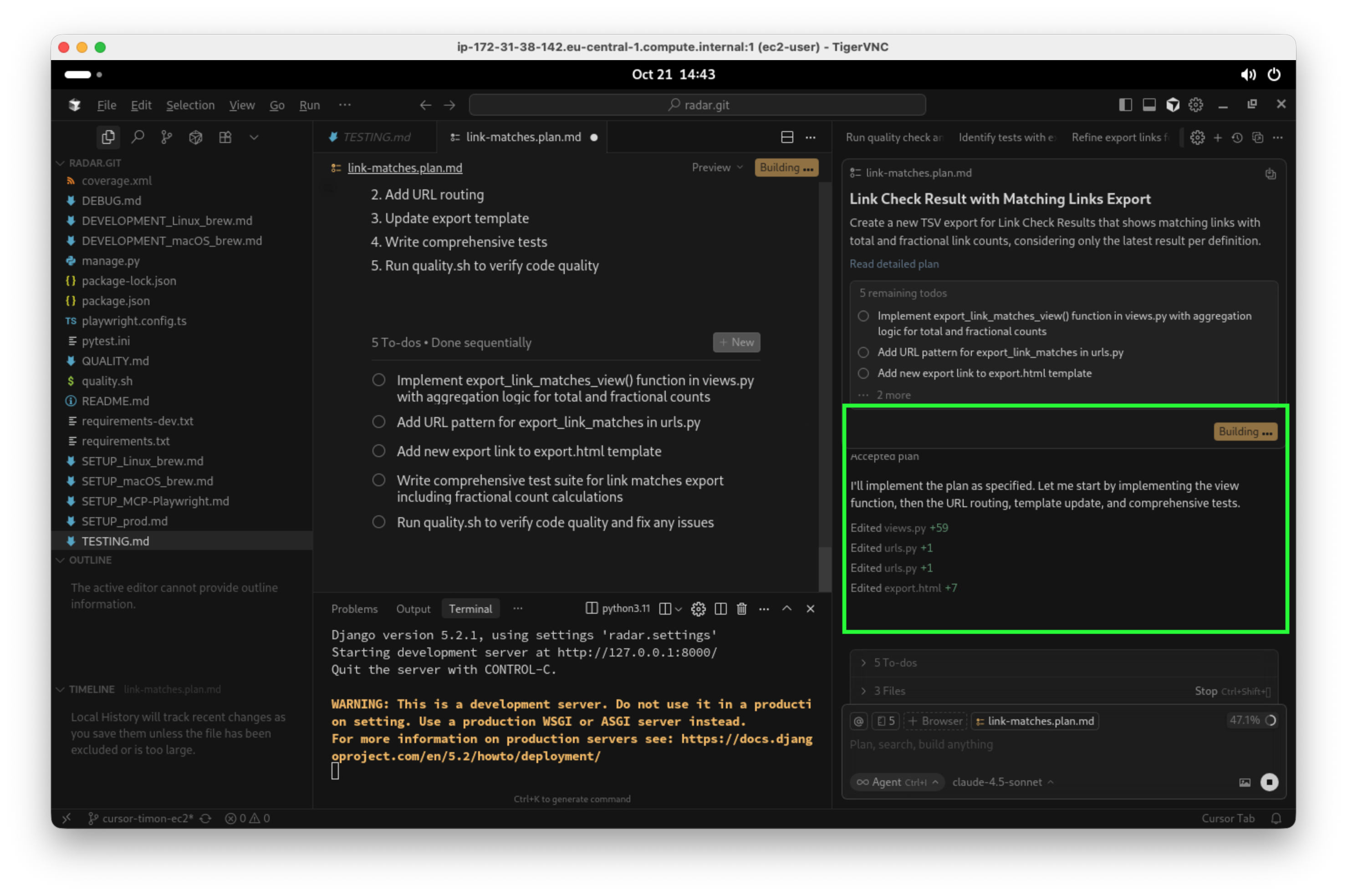 Dank Planungsmodus stellt der Agent wieder von sich aus Fragen, anders als in Beispiel 1 bin ich mit einer der vorgeschlagenen Antworten aber nicht einverstanden. Siehe rote Markierungen im Screenshot: Hier hat der Agent nicht verstanden, dass eine Funktion im Backend schon abdeckt, was nötig ist, und macht abwegige Vorschläge: