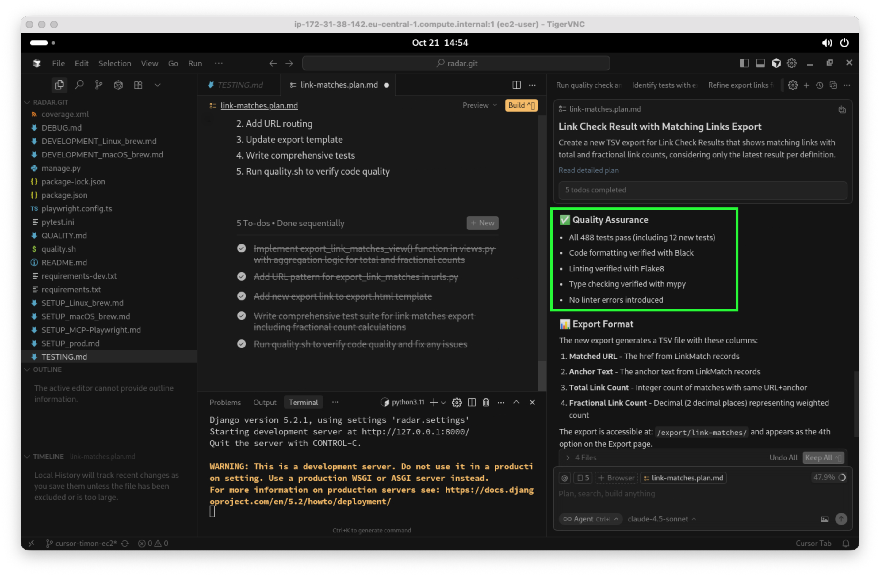 Der Agent hat bemerkt, dass dieses Projekt umfassend mit automatisierten Test entwickelt wird und macht entsprechend detaillierte Vorschläge zum Testen, sehr schön: