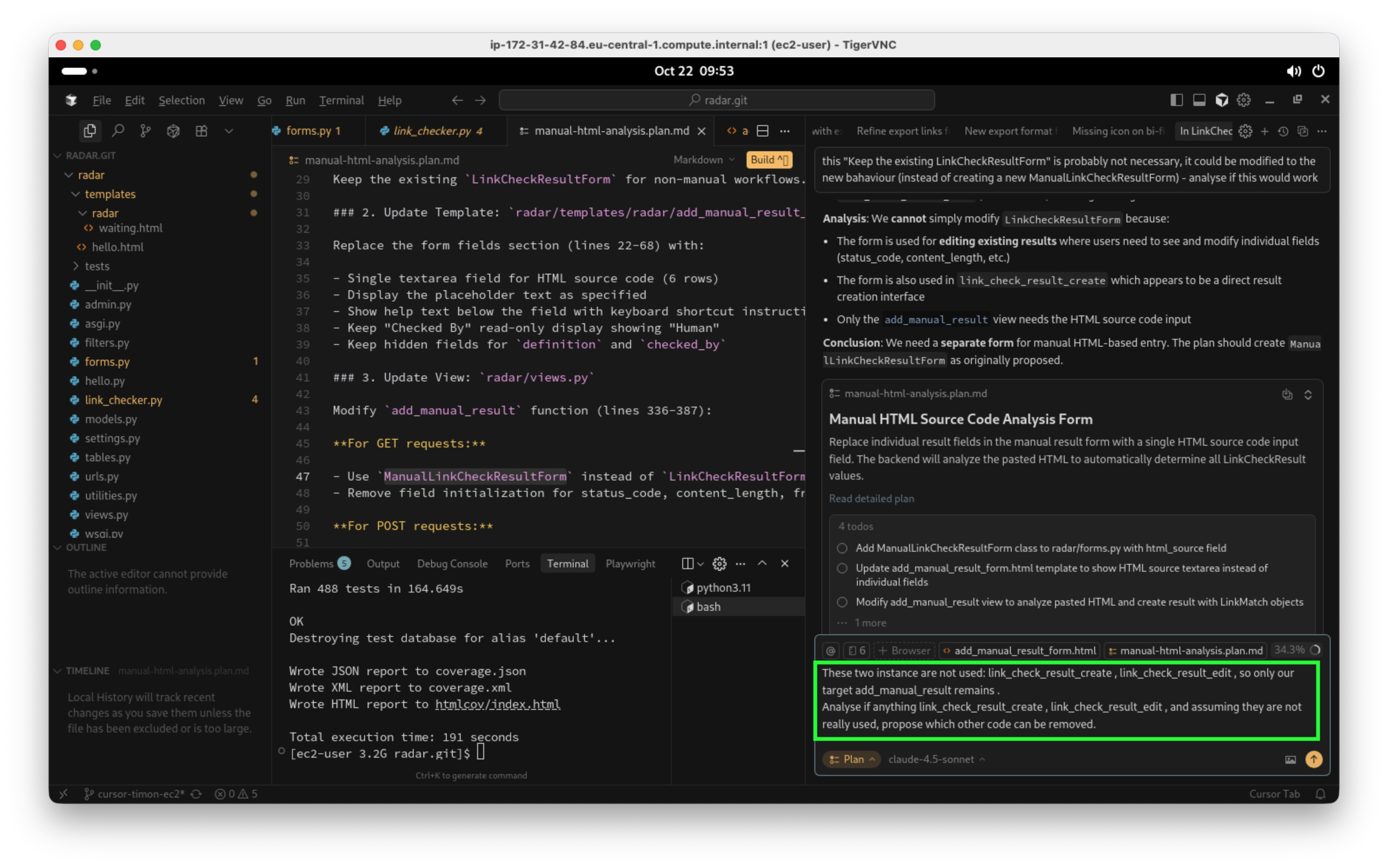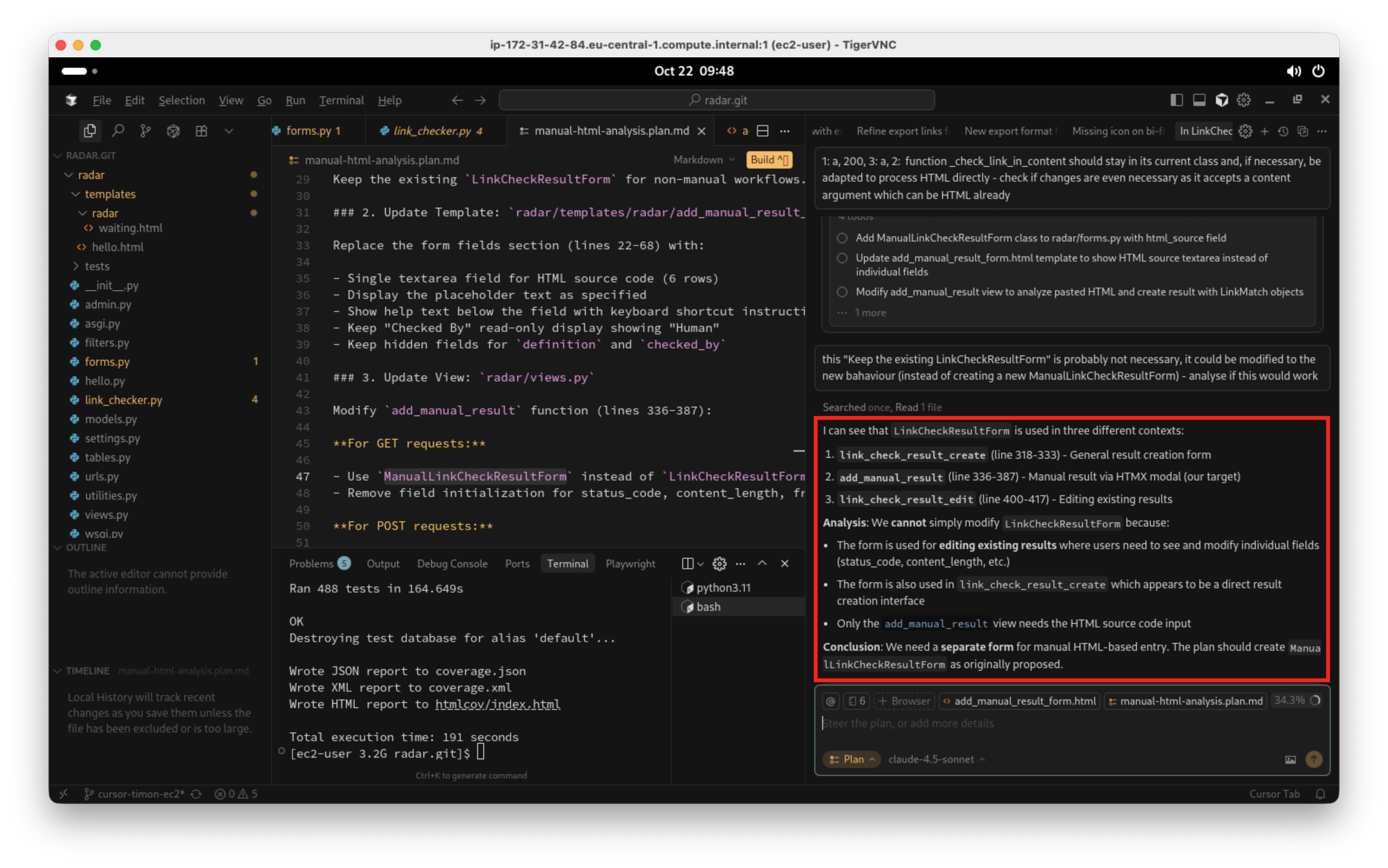 Der Agent berücksichtigt meine Hinweise beim Erstellen des Plans. Allerdings macht mich stutzig, dass eine neue Formularklasse hinzugefügt werden soll, denn ich möchte die bestehende Klasse abändern und nicht unnötig zwei separate Klassen in der Codebase haben. Ich beauftrage eine weitere Analyse: